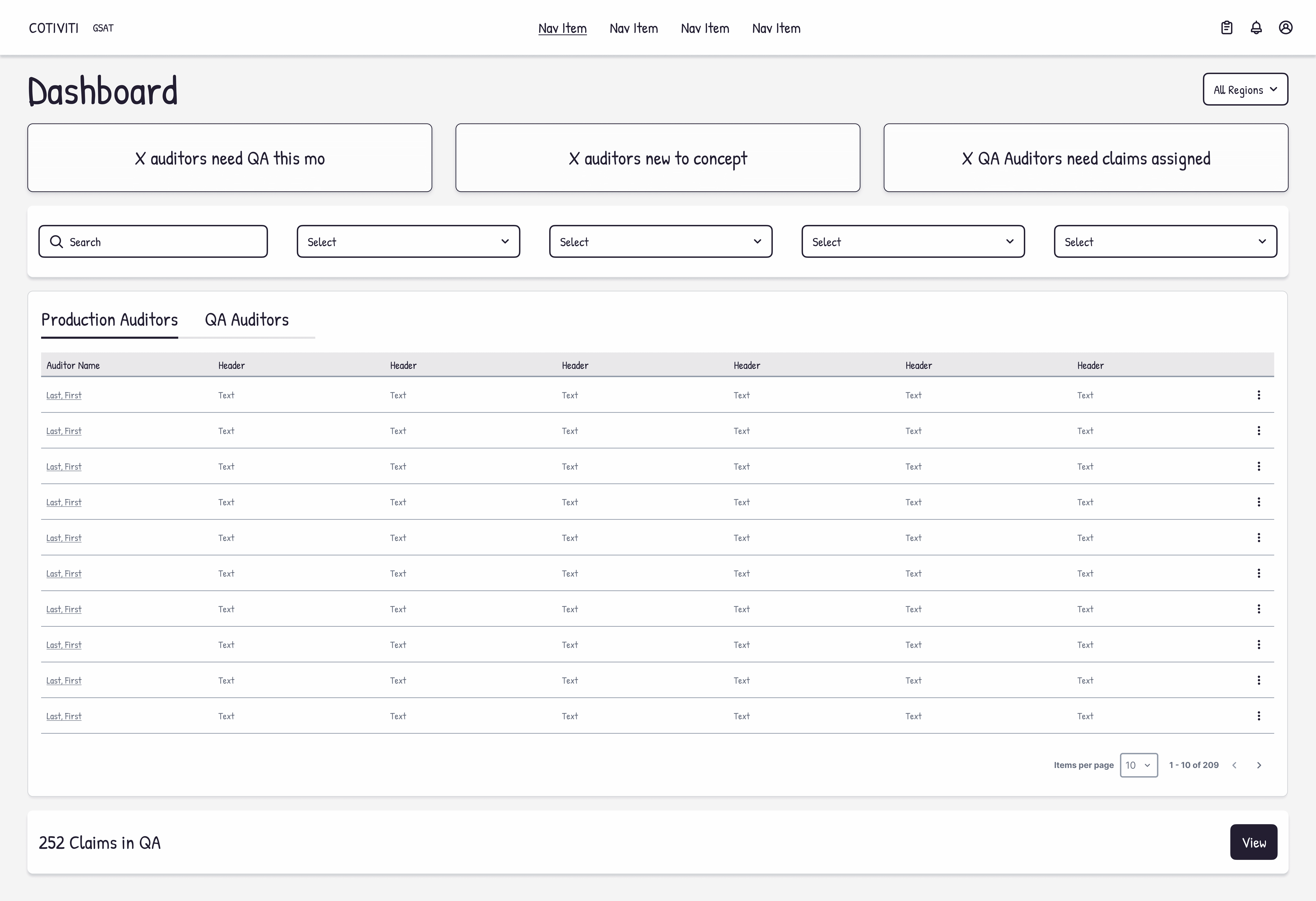 Moving into mid-fidelity was the phase where structure met content, and where conversations with users and stakeholders became more concrete. Sharing these mockups helped us identify what metrics they use to understand workload, performance, and urgency at a glance. We defined what needed to be filterable, what belonged in tables, and what needed to surface immediately for decision-making. This included elements like auditor role and type, claims processed month-to-date, accuracy scores, QA percentages, and month-over-month changes.