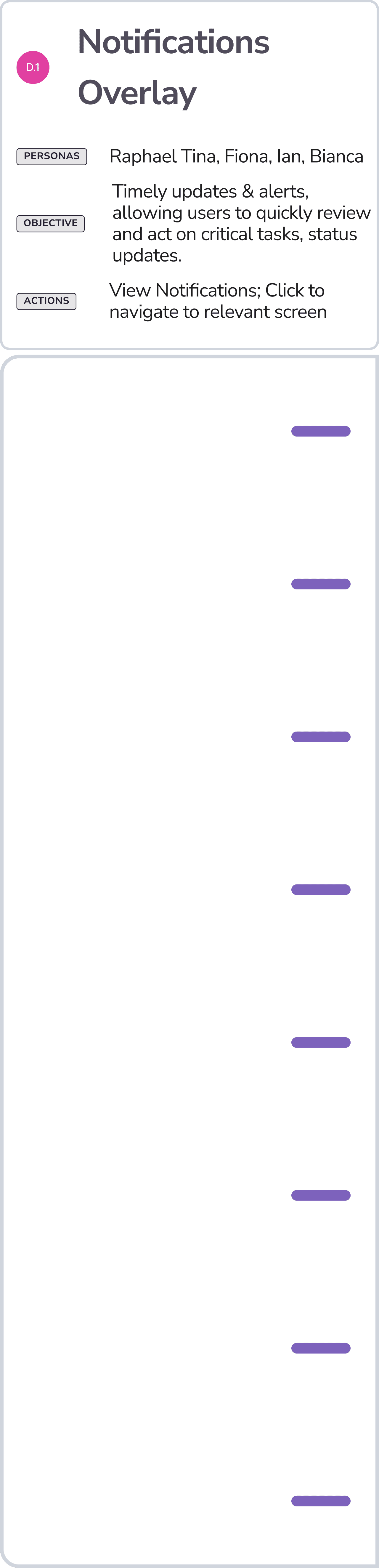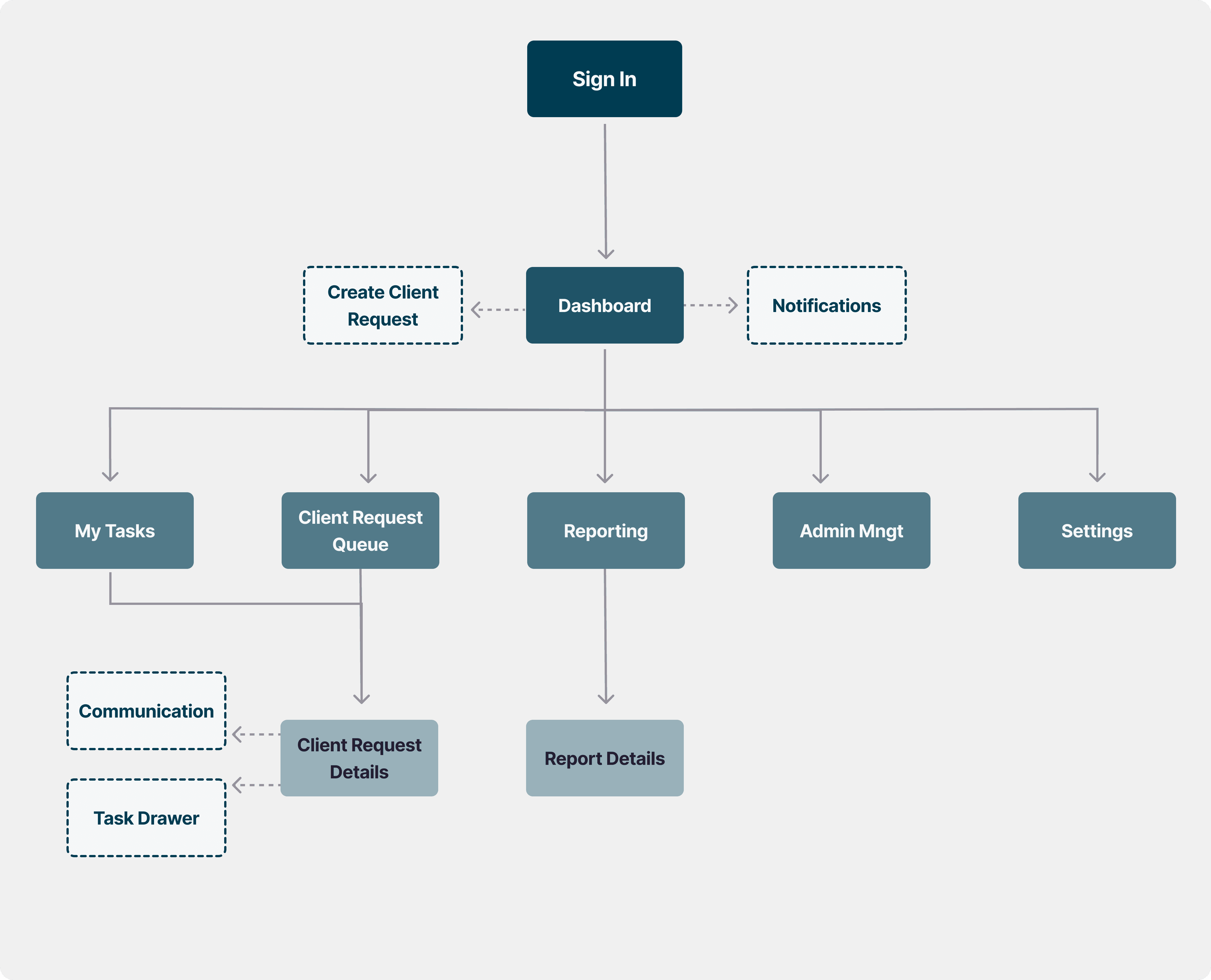 Insights from user interviews helped us identify the key needs and priorities across teams. We translated these into a sitemap that clarified the structure of the tool and highlighted the most critical task flows, from request submission through approval. One of the biggest breakdowns in current state was a lack of accountability, and this issue was factored in throughout the solution.