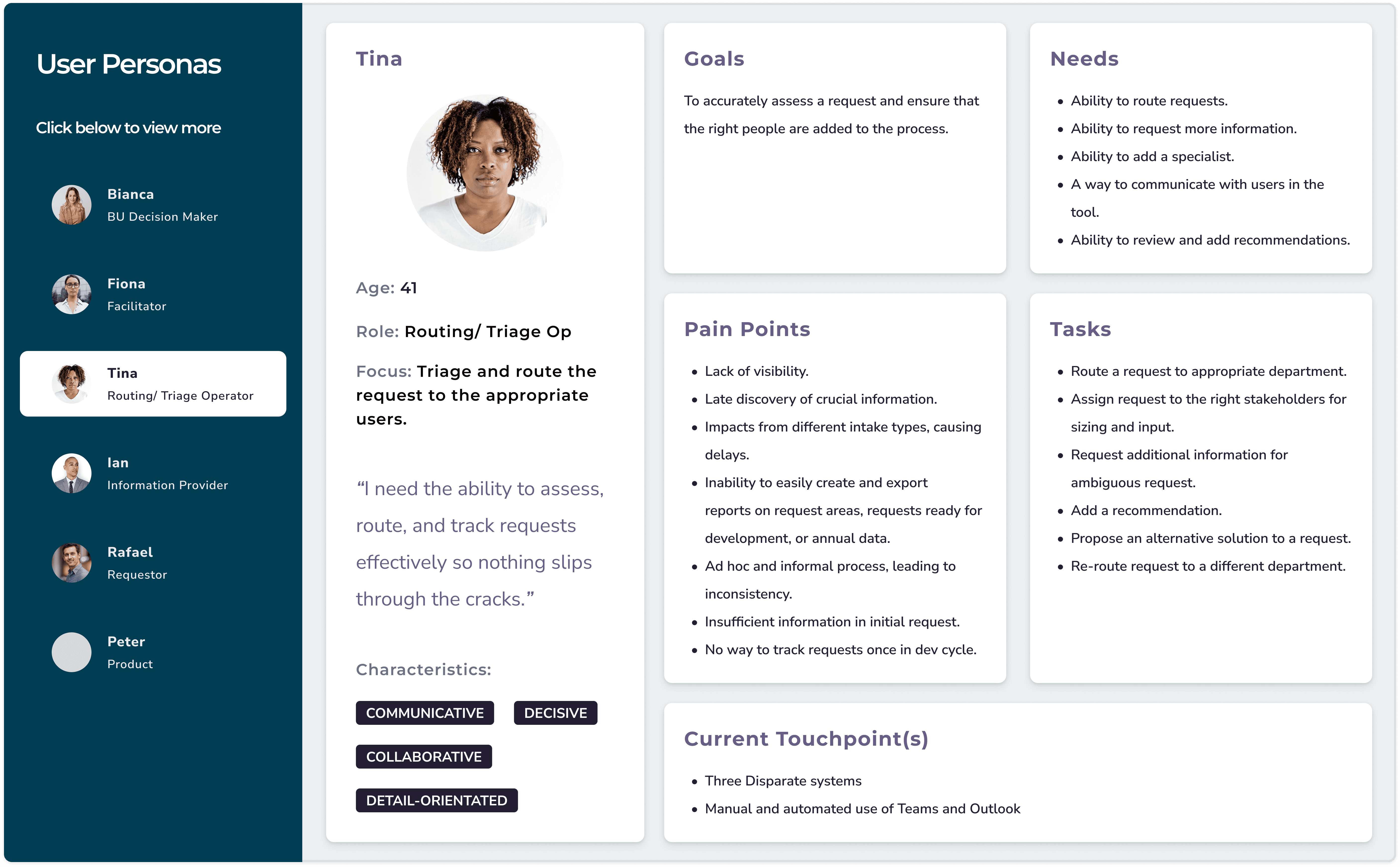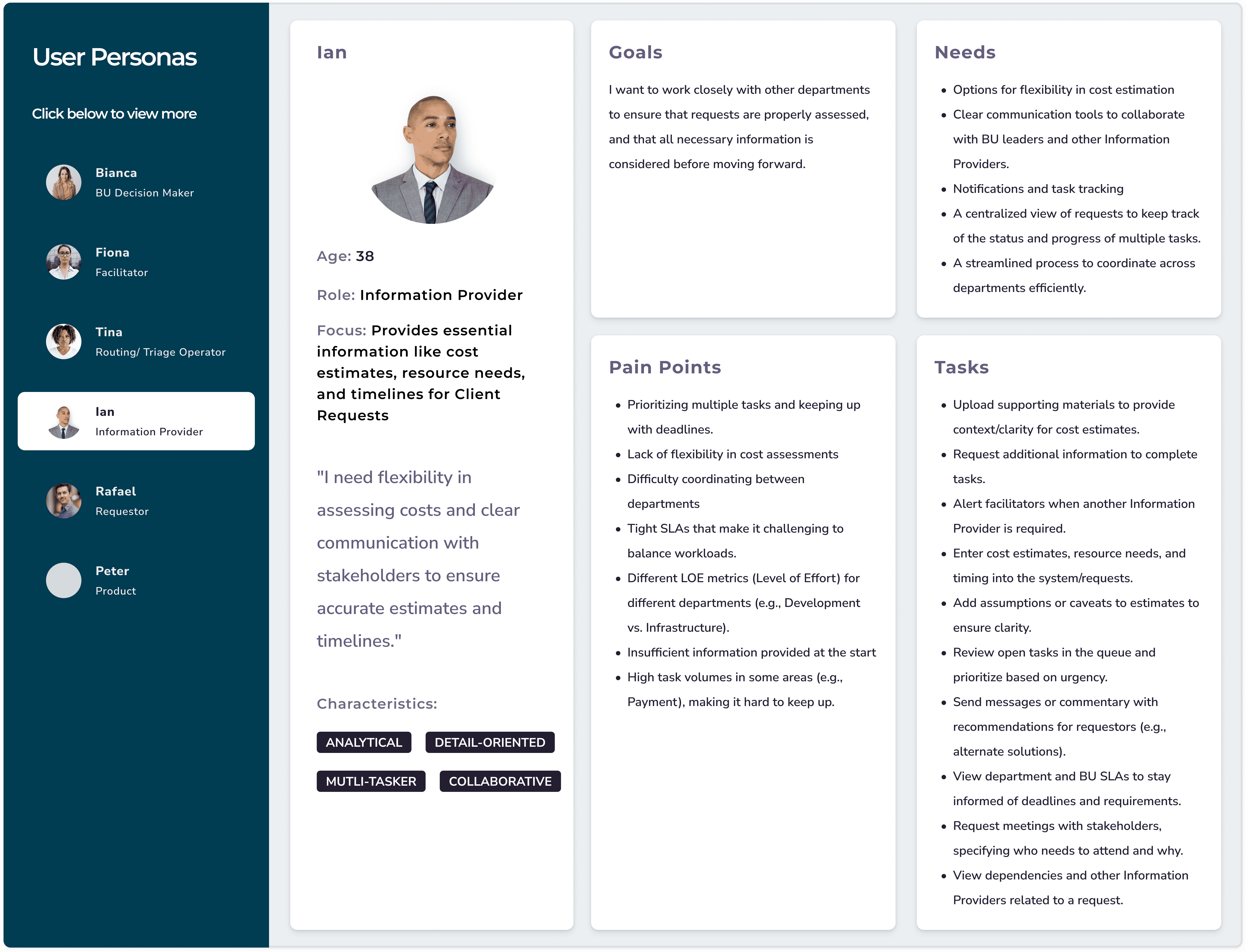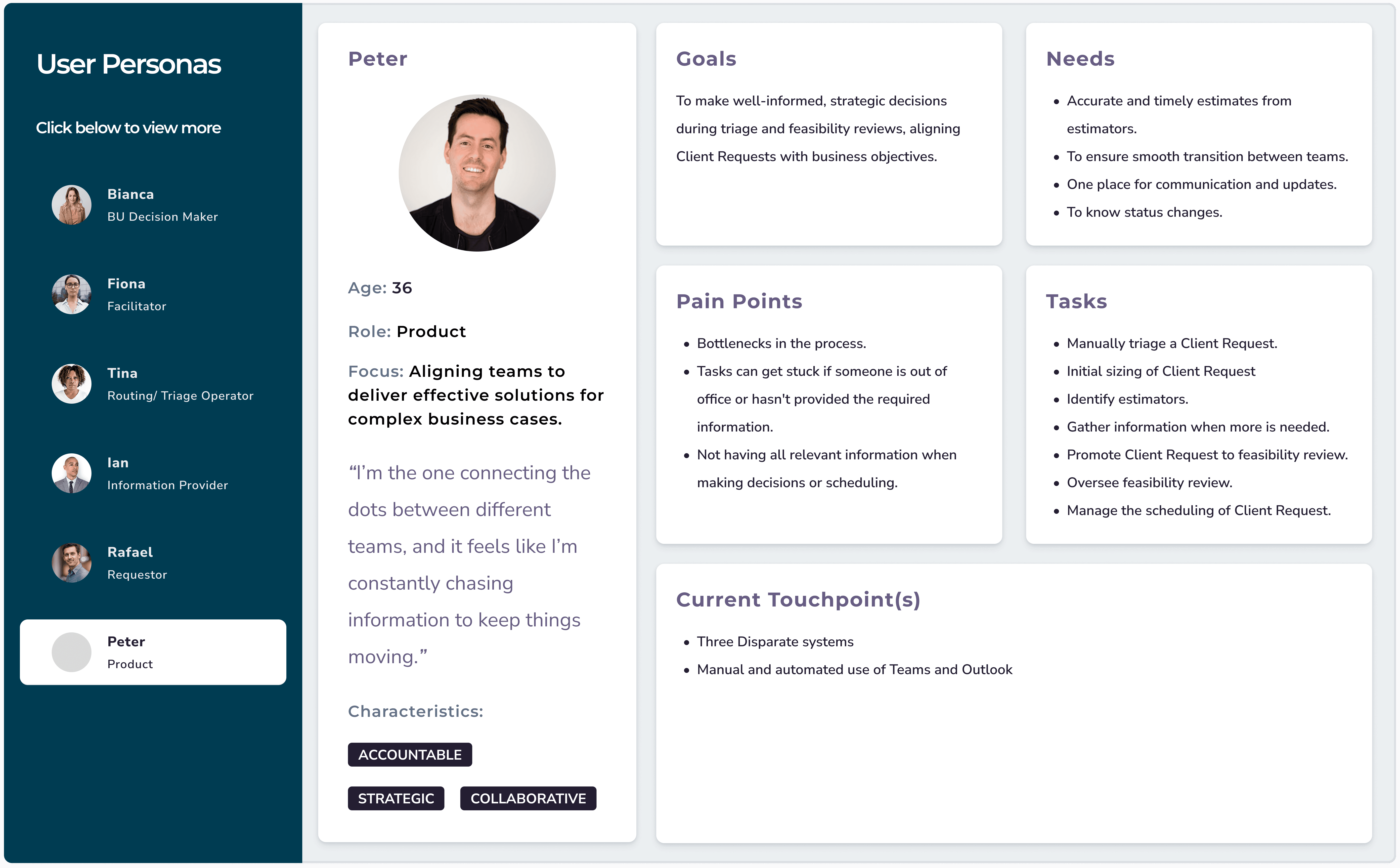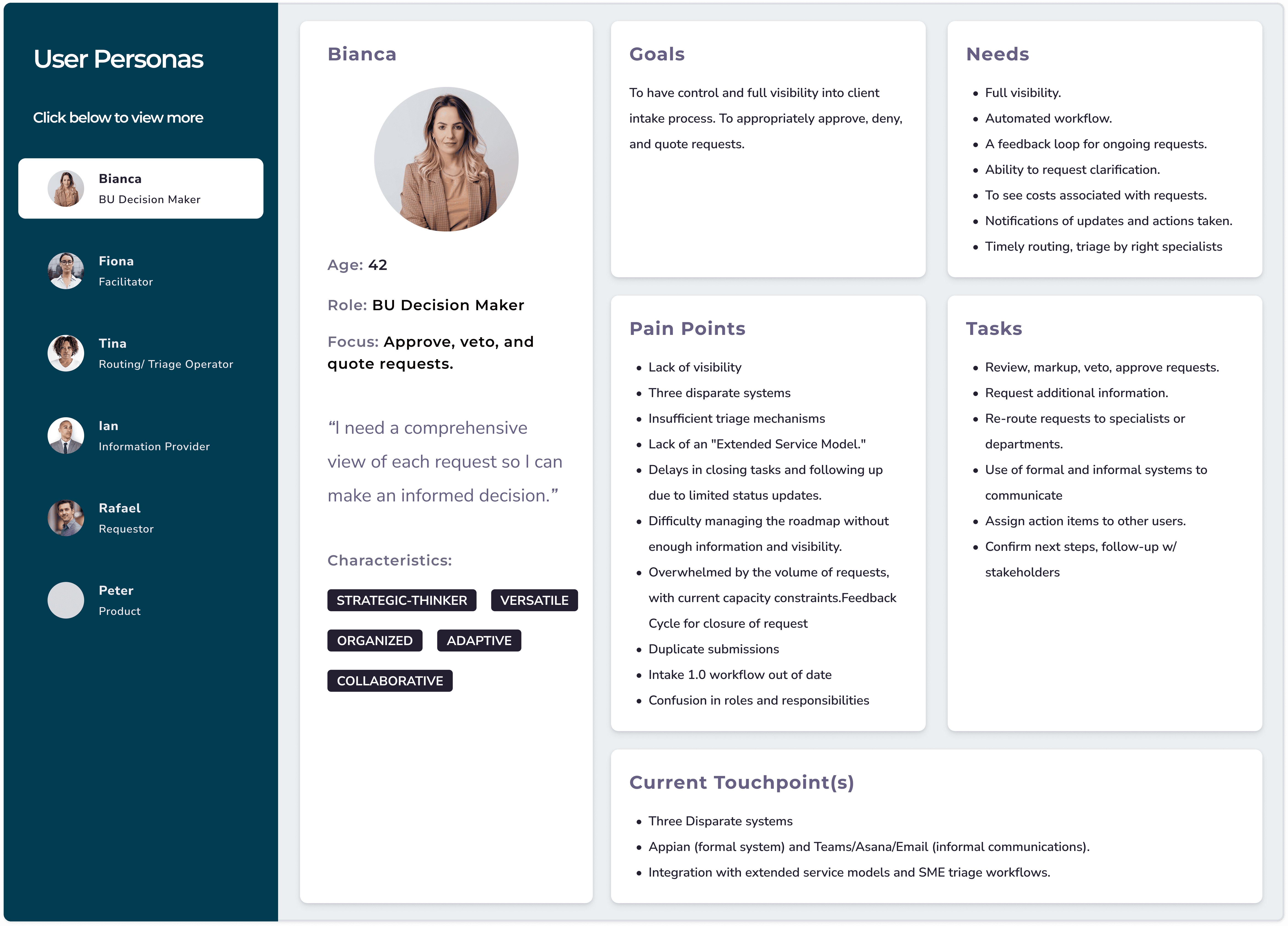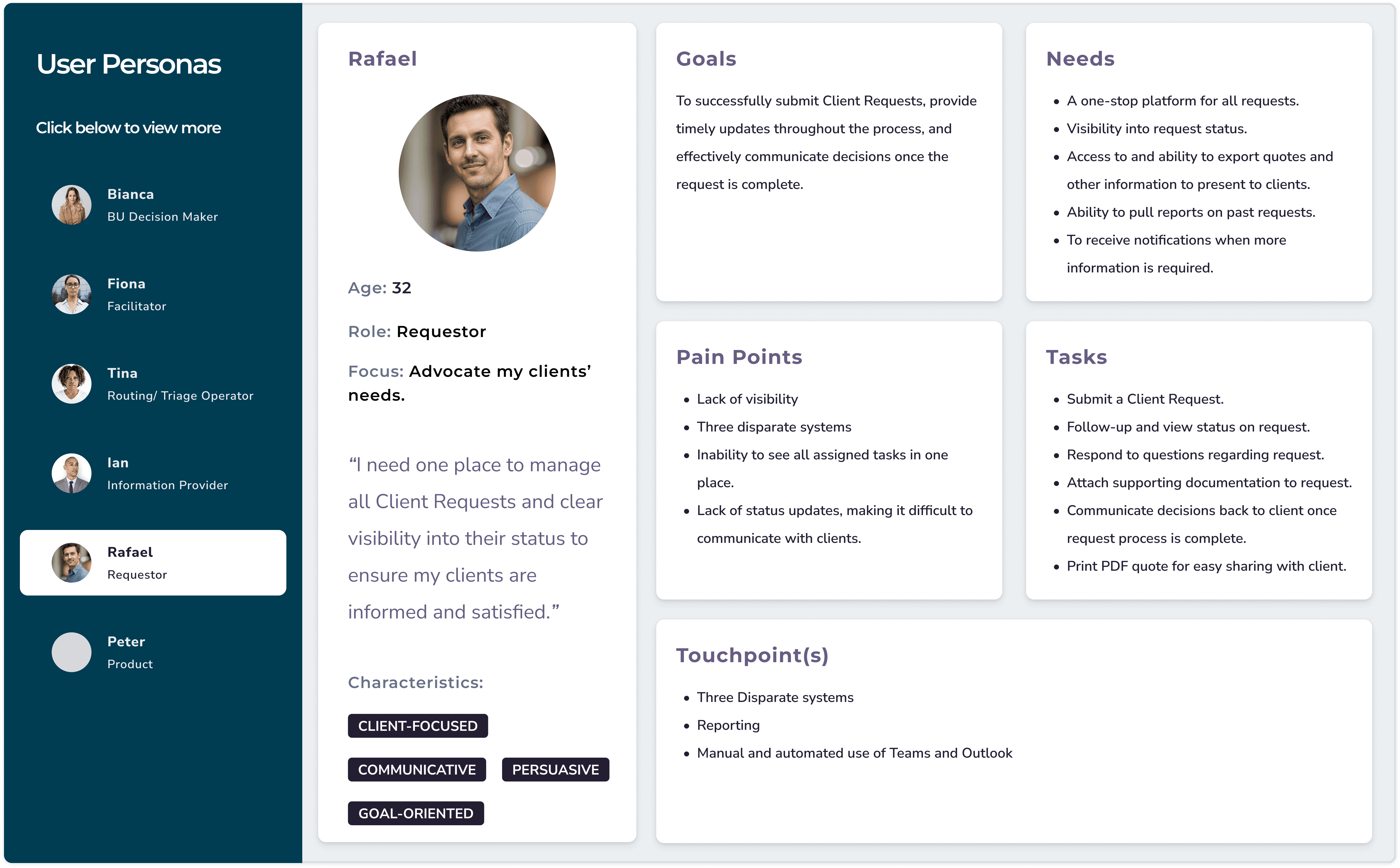We focused on six different personas for this application, those involved across the entire client intake process, including Sales, Implementation, Product, Development, and Business. We learned about each of the user's needs and heard over and over about the lack of visibility and constant bottlenecks.