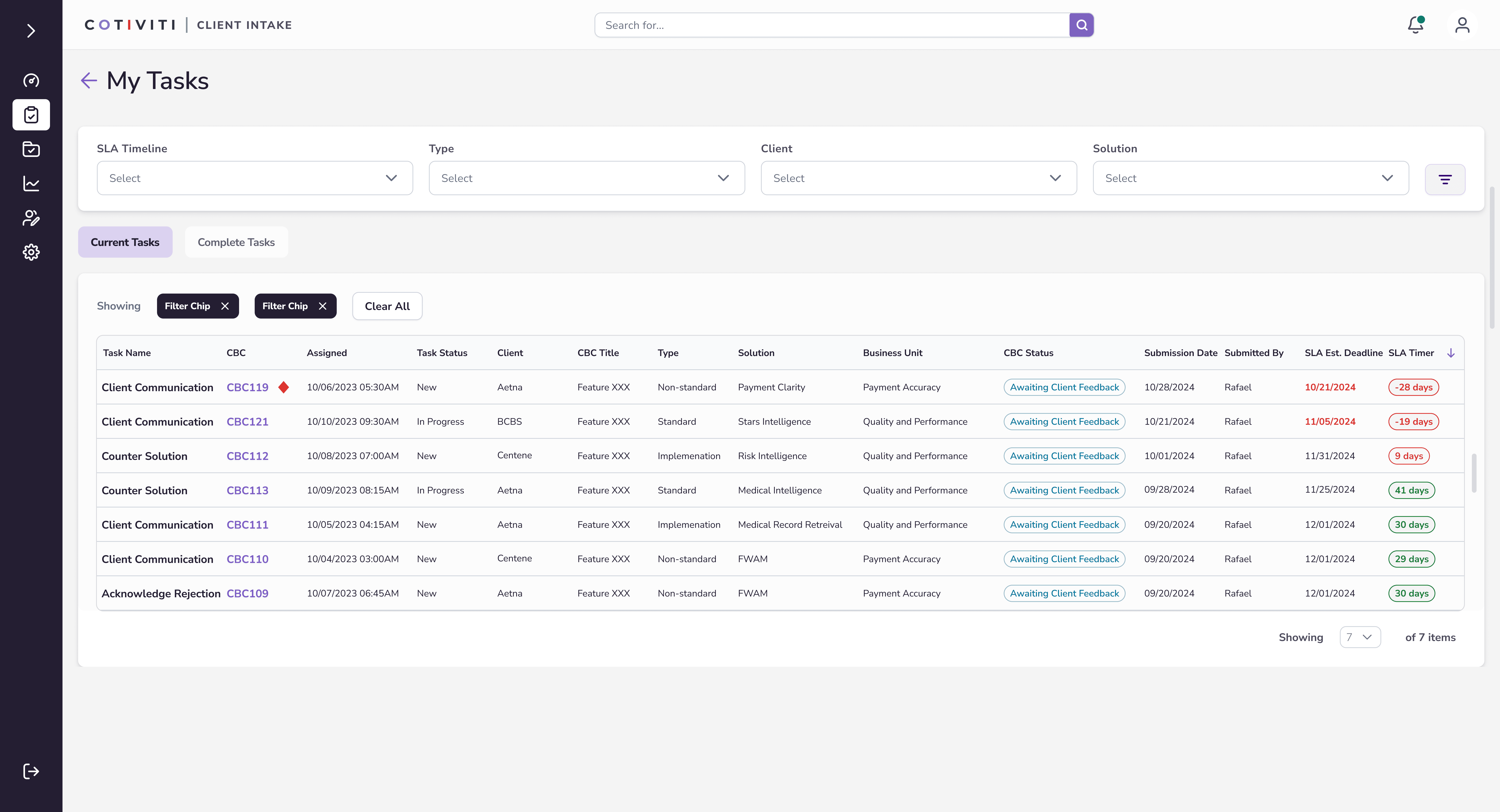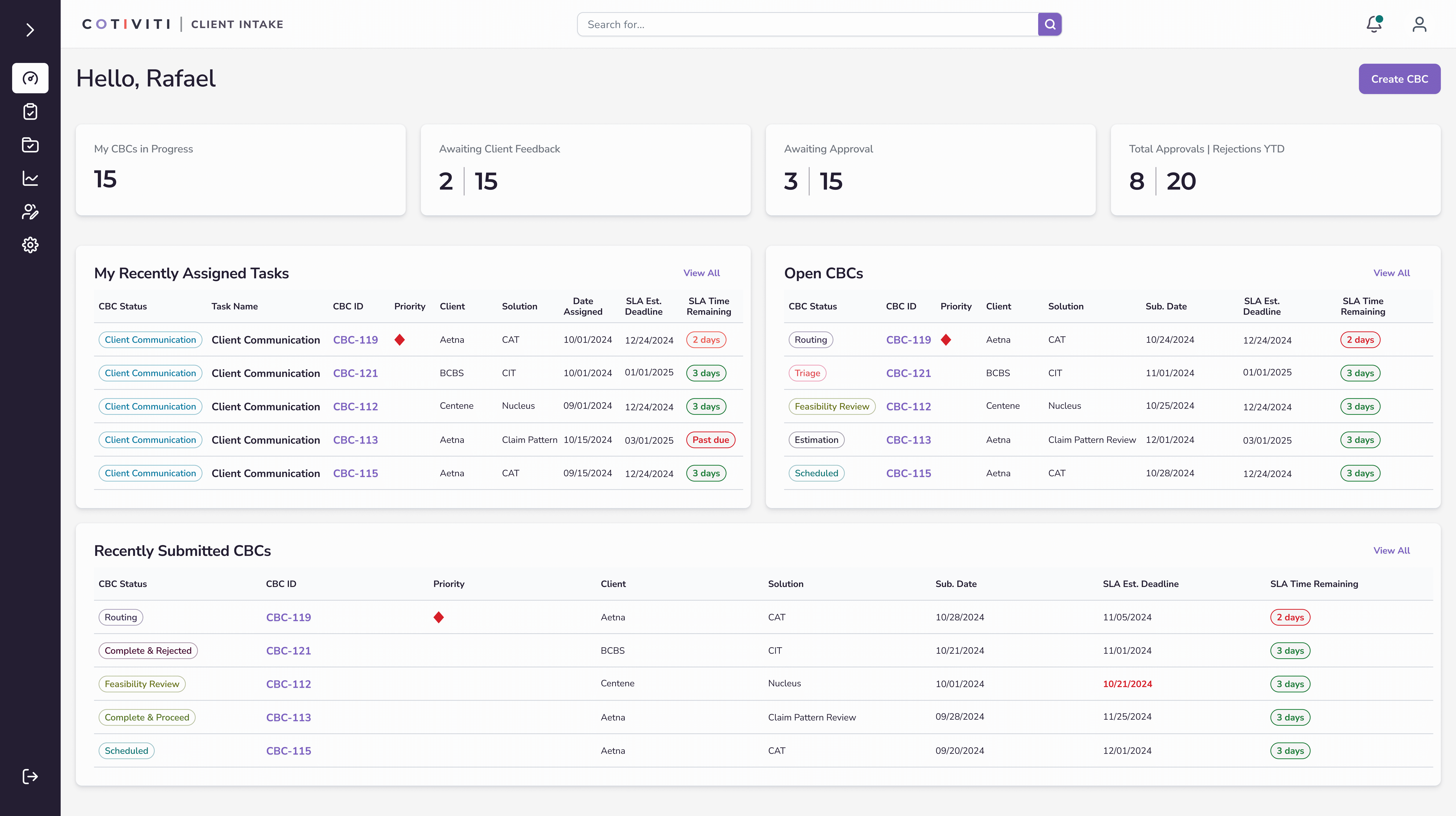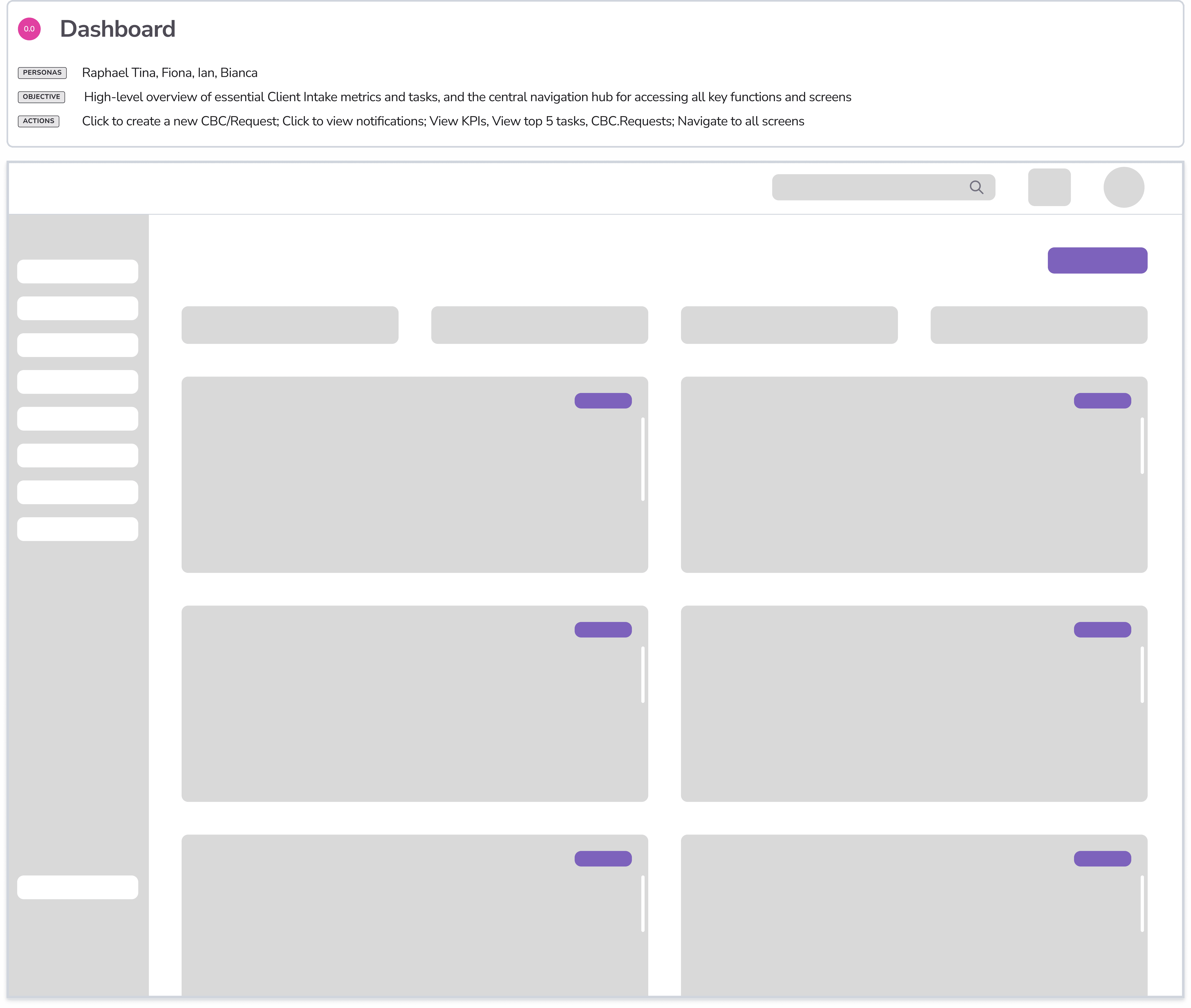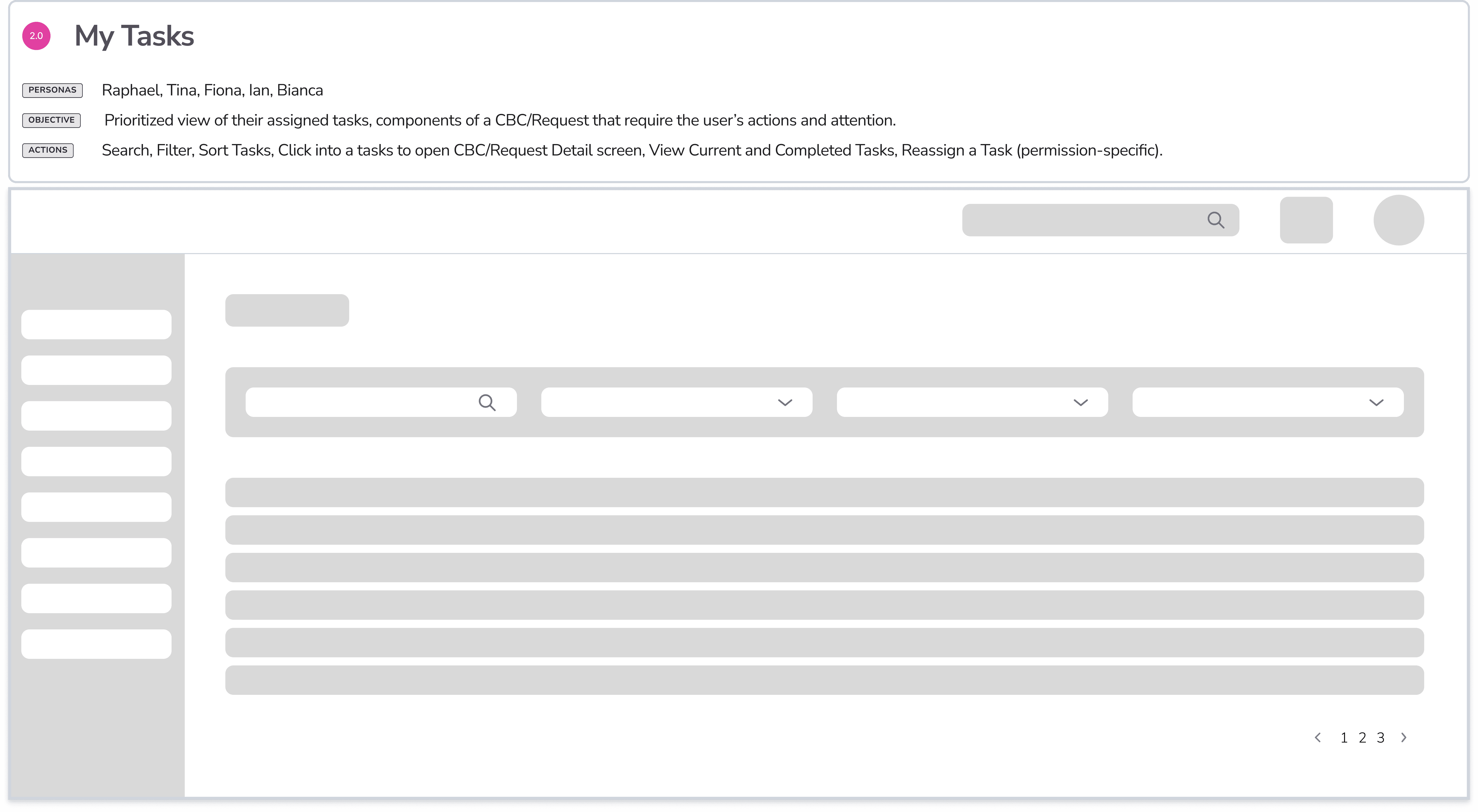 Low-fidelity wireframes allowed us to validate solutions with the team, still focusing on the full client intake flow through the system. A dashboard, serving as the landing screen, surfaced key metrics as well as prioritized tasks. Notifications were also included to ensure users knew what was needed of them and when. The My Tasks screen mirrored similar project management solutions and included search, filtering and sorting capabilities. Again, the goal was to help the user know exactly what tasks were required with associated SLAs. The primary screen of the application was the client business case details screen. All details, tasks, history, notes, documentation was to be included in this important screen.